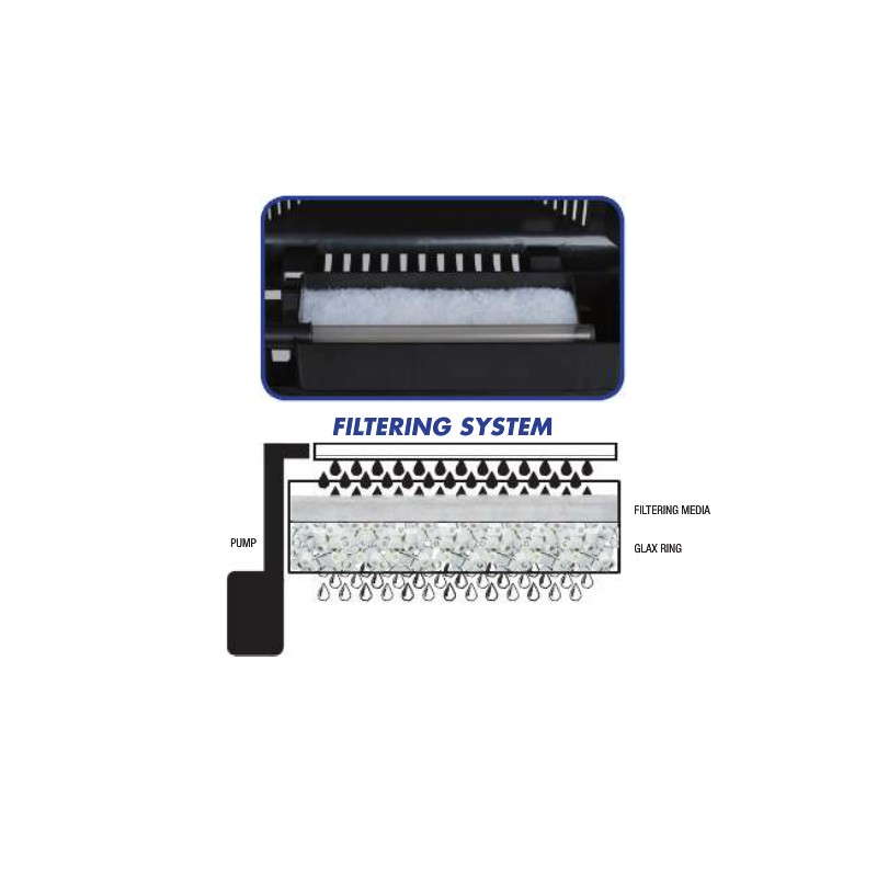 Gracias al eficaz sistema de filtración mecánica y biológica se consigue una buena calidad de agua y estabilidad en el acuario. Consiste en un filtrado clásico con tubo de aspiración y "filtro de teja" que permite un cultivo biológico correcto.